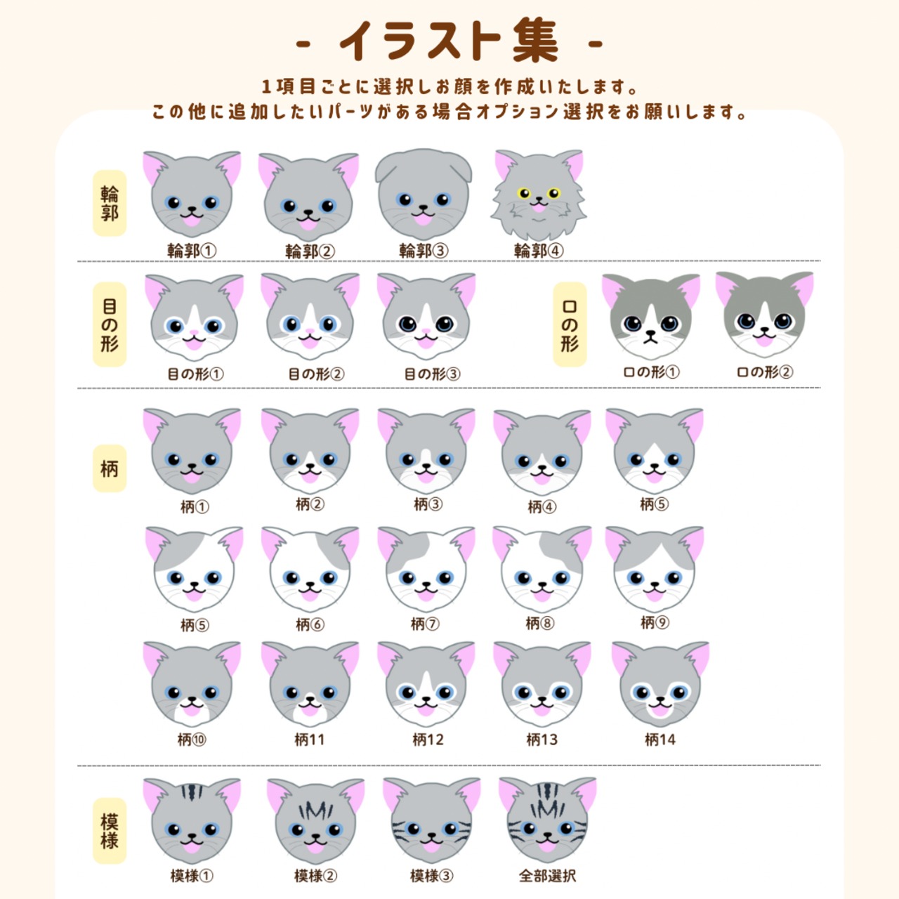 既存イラストから柄入れやお顔パーツなどの変更する場合はオプション選択(+300円)をお願いいたします。